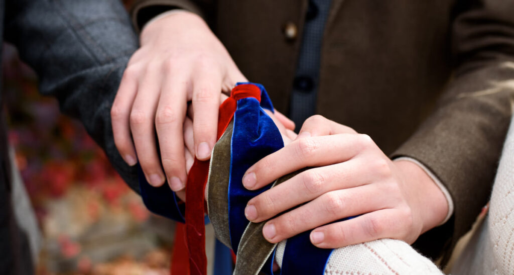 Las cintas pueden ser de distintos colores, que representen valores como el amor o la fidelidad, y se acompañan de la pronunciación de votos emotivos sobre su historia de amor. De este ritual proviene la expresión tying the knot o “atar el nudo” en español.